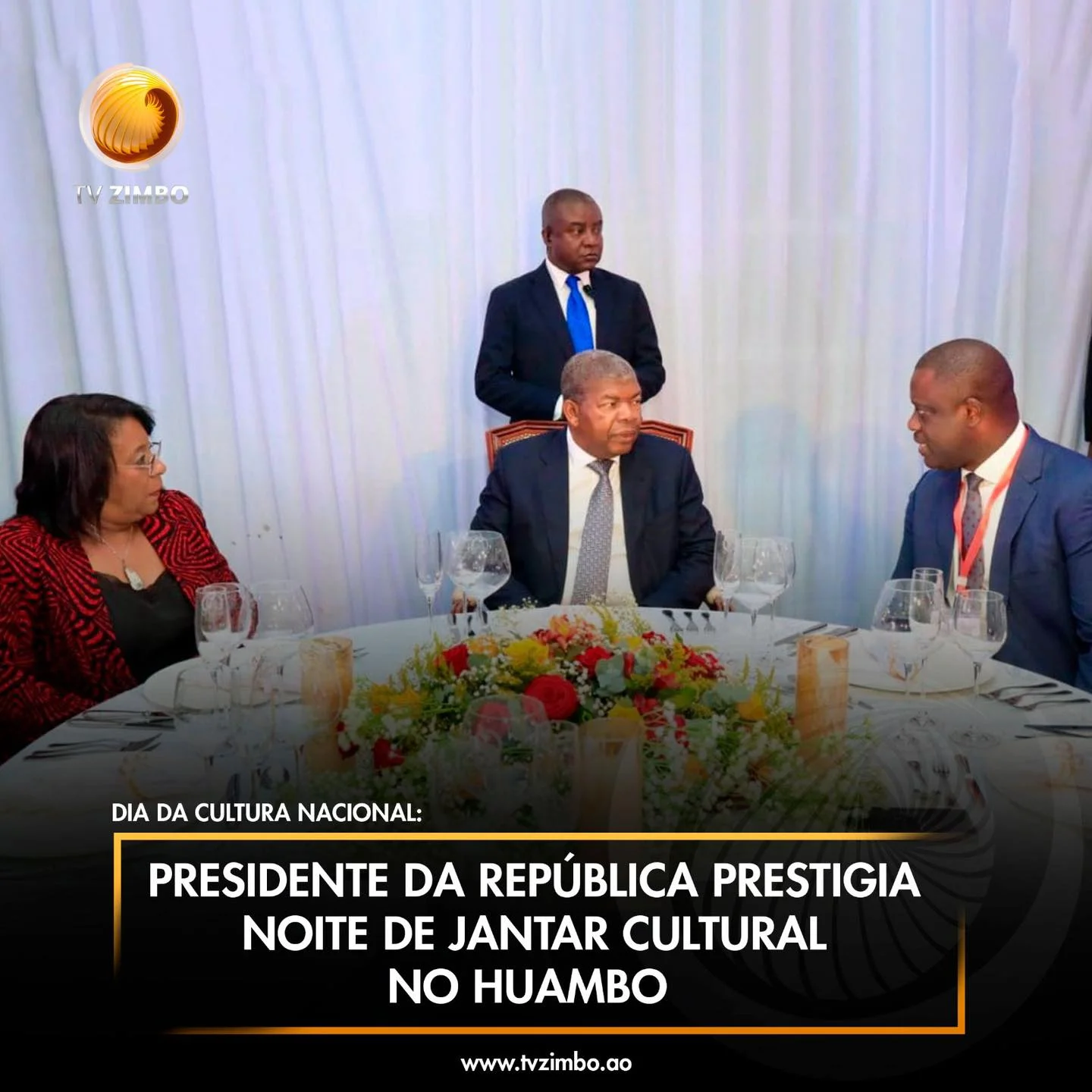 O Presidente da República, João Lourenço, participou como convidado de honra no jantar de encerramento das comemorações do Dia da Cultura Nacional, na cidade do Huambo. Durante o evento, partilhou a mesa com o governador da província, Pereira Alfredo, a Ministra de Estado para a Área Social, Maria do Rosário Bragança, e o Ministro da Cultura, Filipe Zau. O jantar foi marcado por um ambiente de celebração e reconhecimento, destacando a importância da cultura como elemento unificador e impulsionador do património angolano.