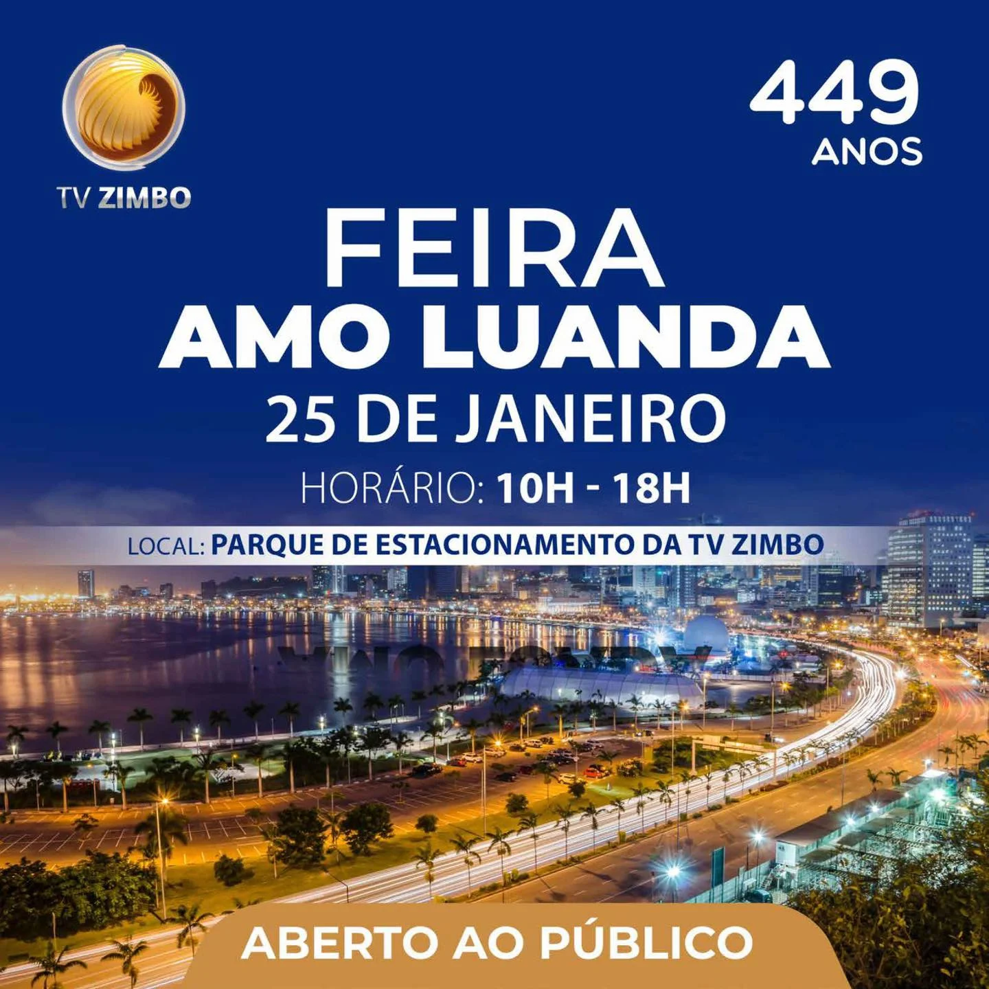 A TV ZIMBO realiza, este sábado, 25 de janeiro, a feira “Amo Luanda”, em comemoração ao 449.º aniversário da província de Luanda. O evento terá lugar no pátio da emissora, das 10h às 18h, com entrada gratuita para o público. A feira reunirá uma exposição diversificada de produtos e serviços, oferecendo uma oportunidade para celebrar a cultura e o desenvolvimento da capital angolana.