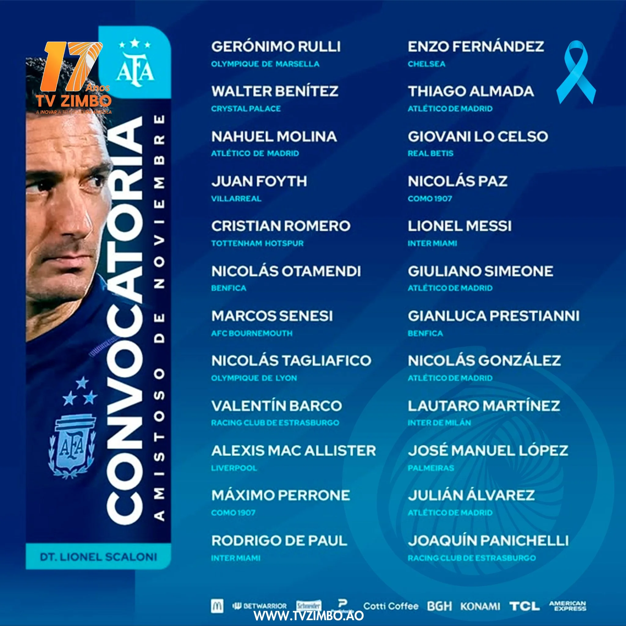 A Associação de Futebol Argentino (AFA) divulgou nesta quinta-feira a convocatória oficial para o jogo amistoso frente à selecção angolana, marcado para o próximo mês. O seleccionador Lionel Scaloni apostou numa combinação de campeões experientes e jovens talentos em ascensão no futebol europeu.