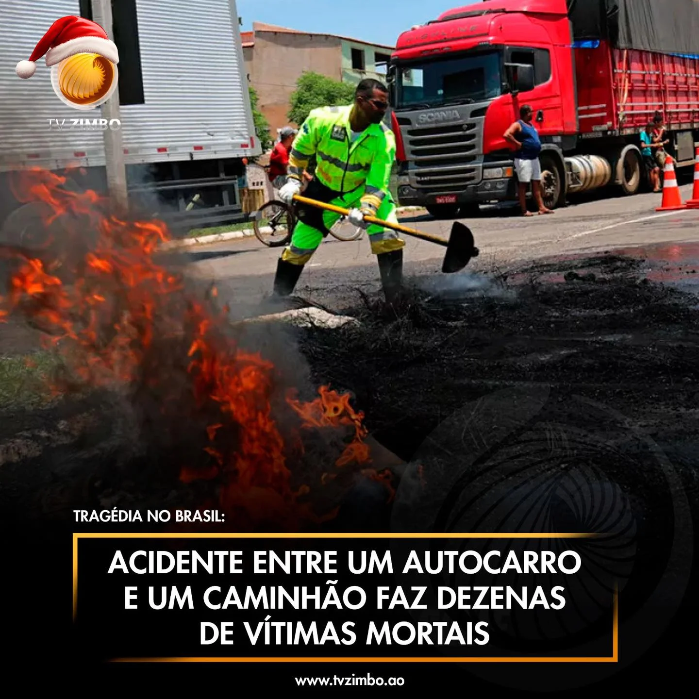 De acordo com as autoridades, o acidente foi provocado pelo rebentamento de um pneu, que fez o motorista perder o controlo do autocarro e colidir com o camião. Um veículo ligeiro também esteve envolvido na colisão, mas os três ocupantes sobreviveram.