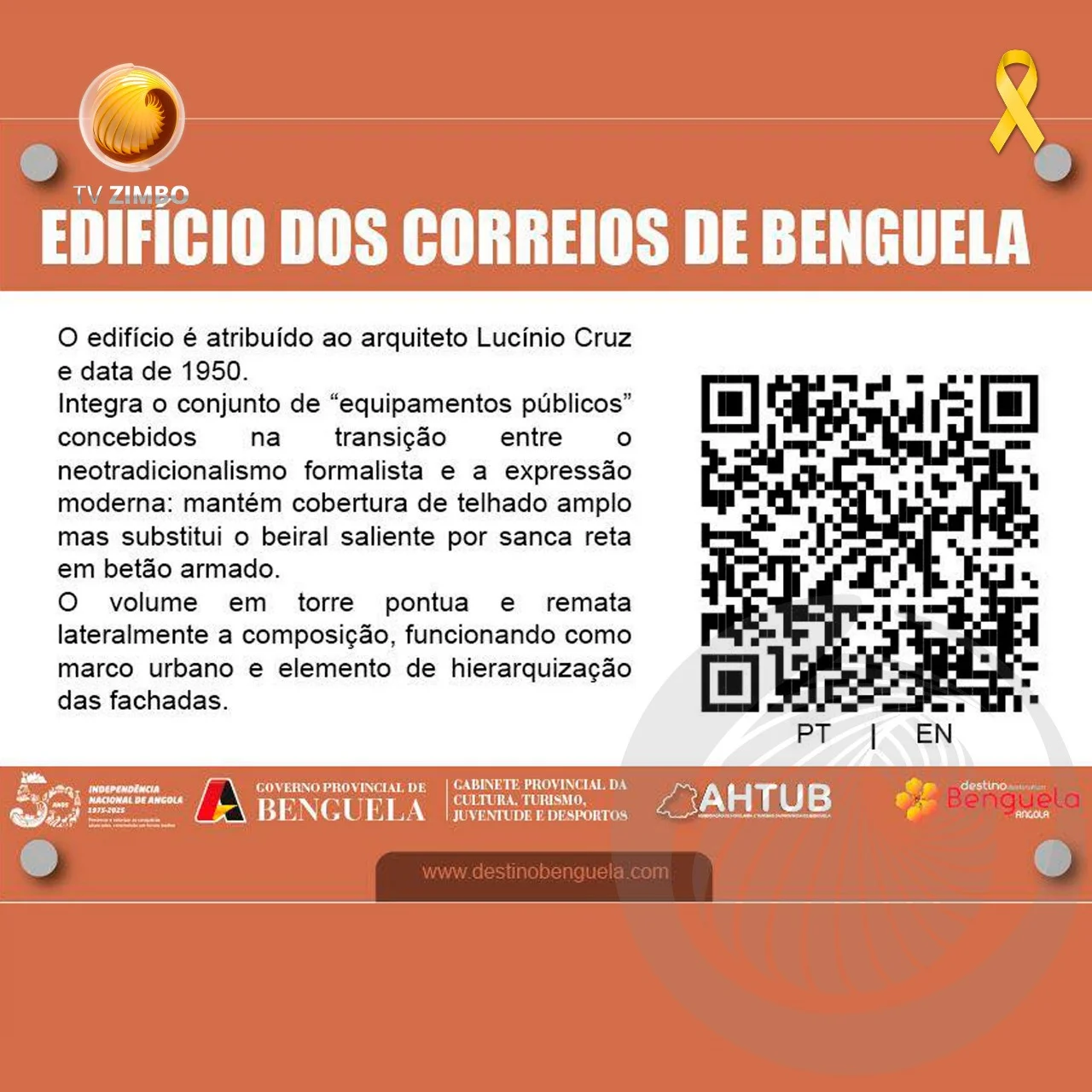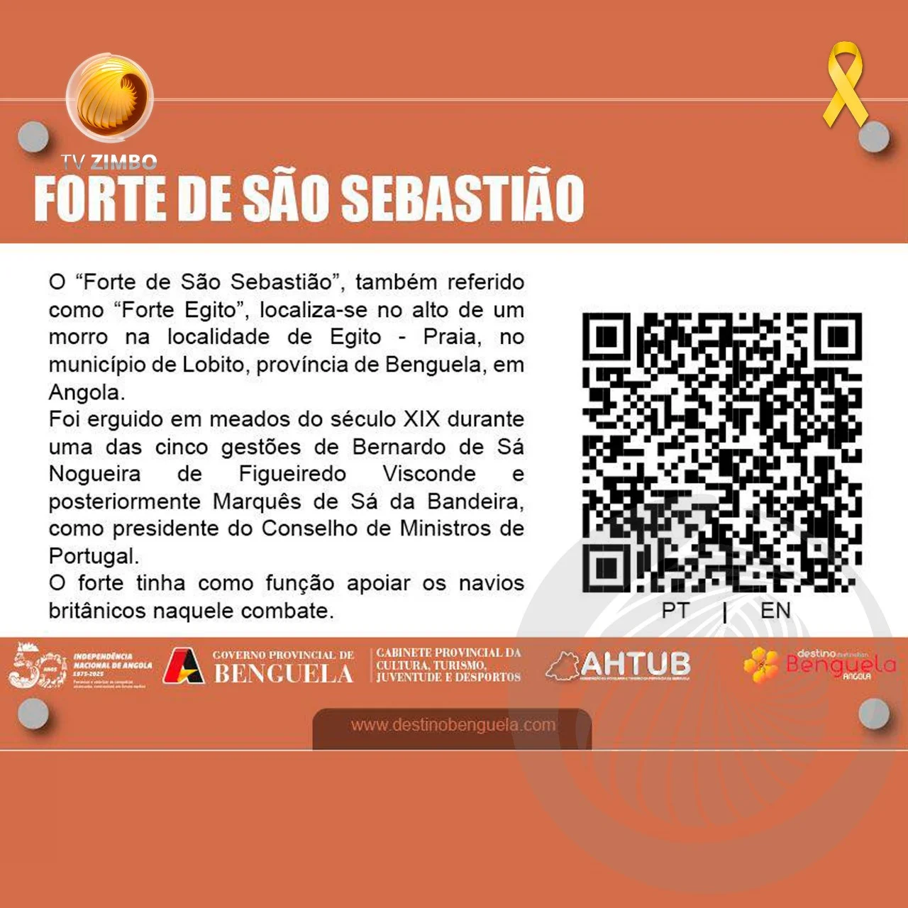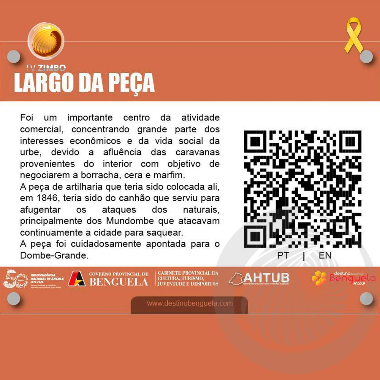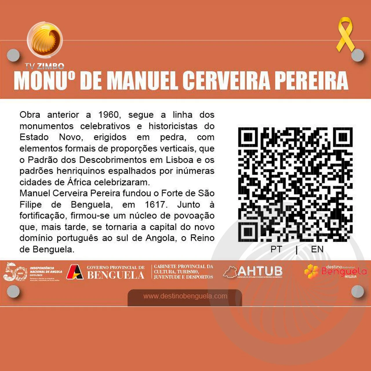 A província de Benguela marcou as celebrações do Dia Mundial do Turismo, assinalado a 27 de setembro, com o lançamento de um projecto inovador que visa aproximar visitantes da história e cultura local. O Governo Provincial, por via do Gabinete da Cultura, Turismo, Juventude e Desportos, iniciou a instalação de placas informativas com “QR Code” em monumentos históricos da província, permitindo aos turistas acederem, de forma rápida e interativa, a conteúdos sobre cada local.