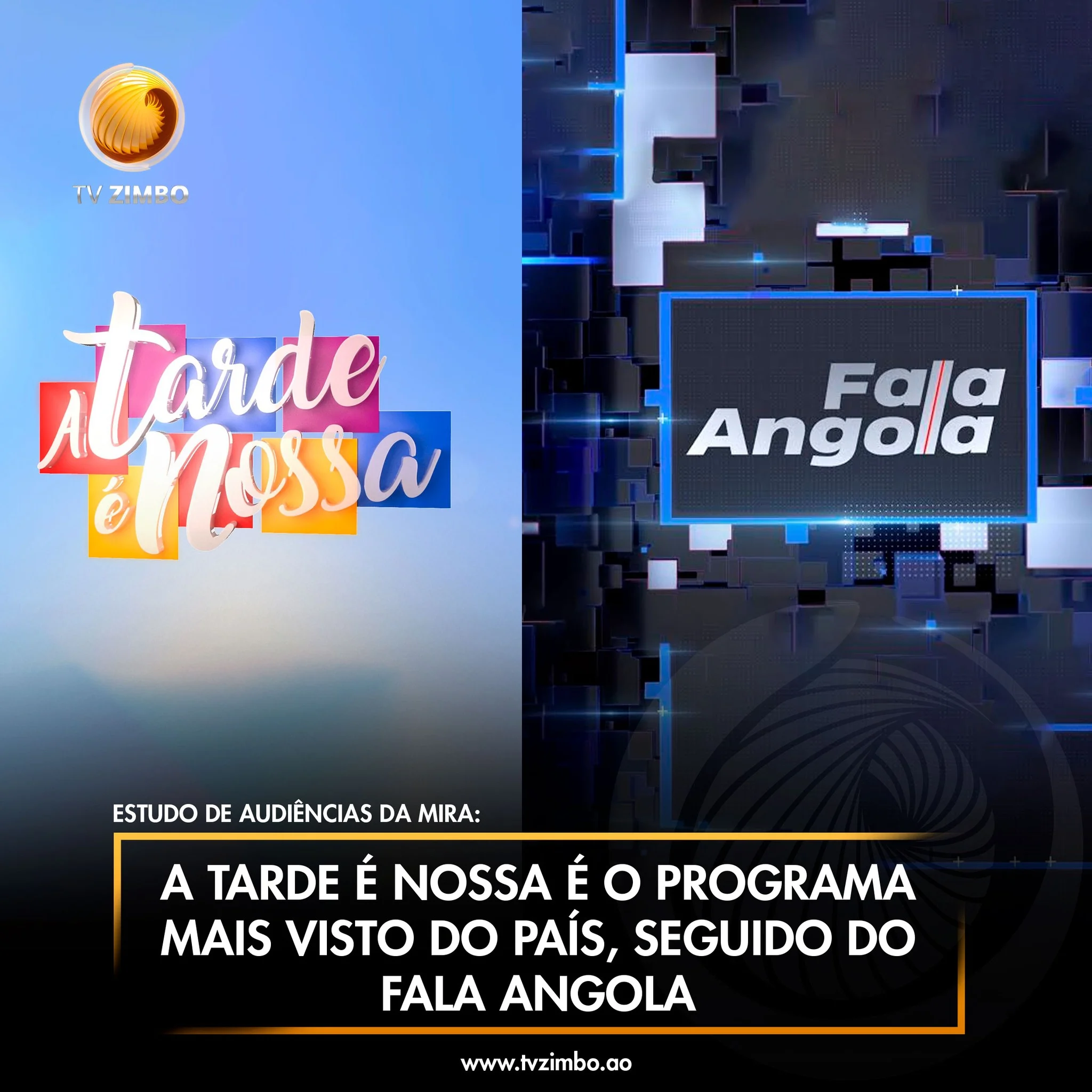 Na mesma pesquisa, o FALA ANGOLA, também da TV ZIMBO, ocupa a segunda posição no ranking dos programas televisivos mais acompanhados no país, com 28% de audiência. Os dados reforçam a influência e o impacto da estação junto do público nacional, destacando a preferência por conteúdos de entretenimento e informação.