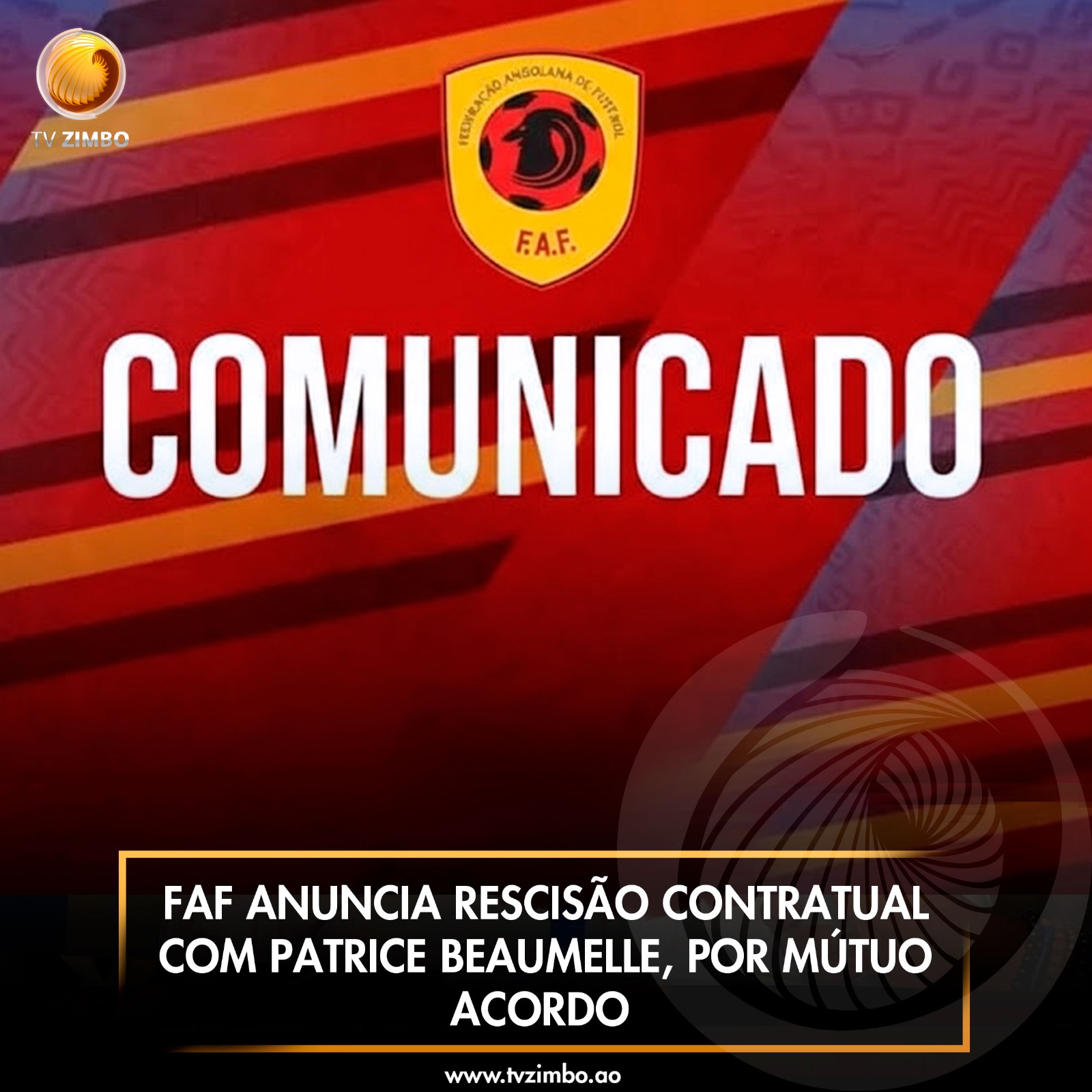 A Federação Angolana de Futebol, FAF, informou que, por mútuo acordo e de forma amigável, foi definida a rescisão contratual com o treinador Patrice Beaumelle, que deixa o comando técnico da Seleção Nacional de Angola. A decisão surge na sequência de uma avaliação profunda, ponderada e consensual entre as partes, após o técnico francês ter manifestado a pretensão de assumir, nos próximos dias, um novo compromisso profissional ao serviço de um clube africano.