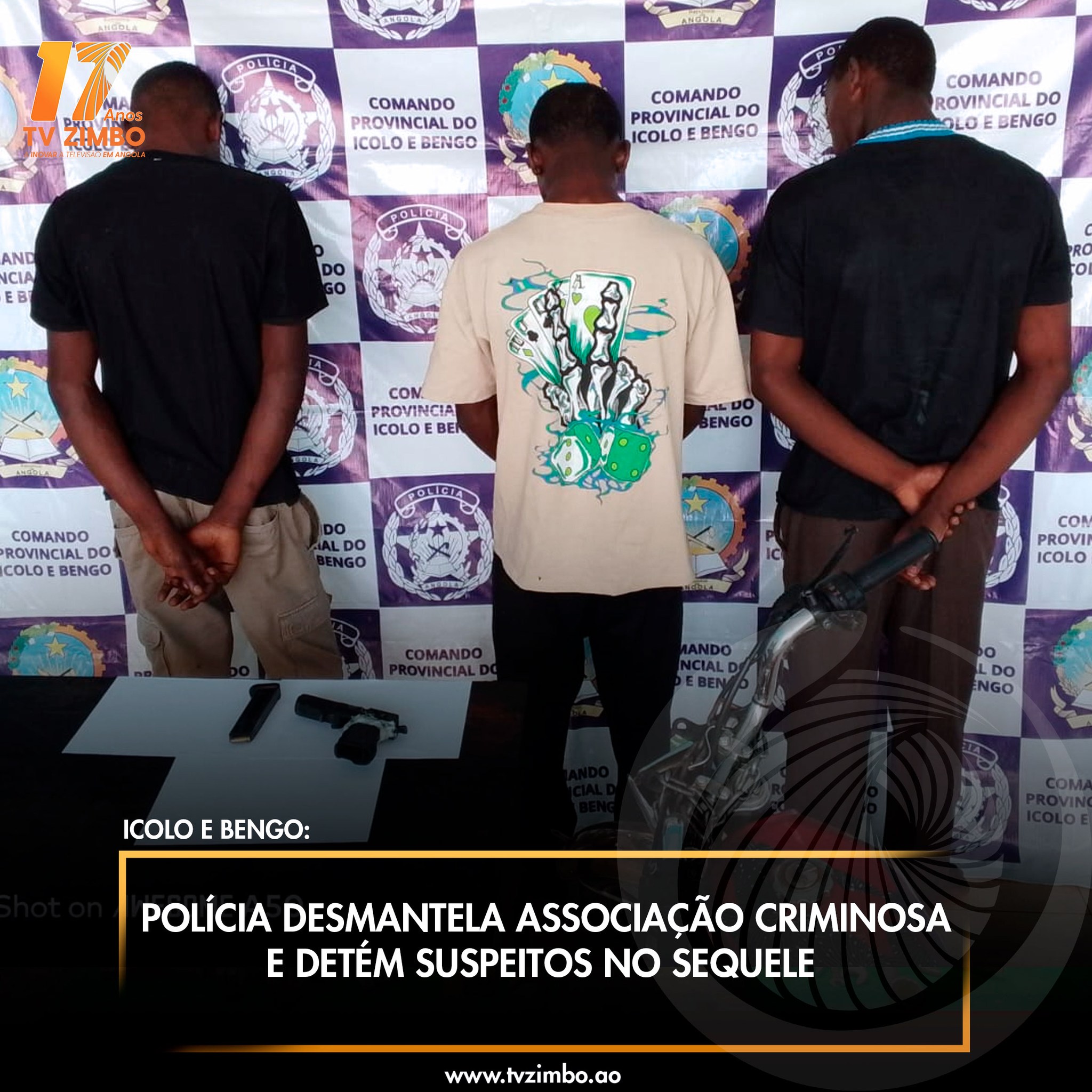 As forças policiais de investigação de ilícitos penais e inteligência do município do Sequele, província do Icolo e Bengo, desmantelaram e detiveram, na tarde de 21 de Janeiro de 2026, uma associação criminosa composta por três cidadãos nacionais, com idades entre 19 e 26 anos, suspeitos de roubo com recurso a arma de fogo do tipo pistola.